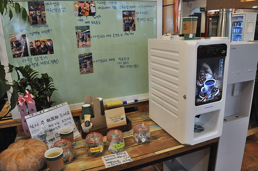식사를 마친 후에는 커피와 차를 무료로 제공하는 디저트 코너가 있어요. 믹스커피뿐만 아니라 캐모마일, 페퍼민트 등 다양한 차도 준비되어 있어서 깔끔하게 입가심할 수 있었습니다. 카페에 가지 않아도 여기서 차 한 잔 하면서 여유롭게 마무리할 수 있어 좋았어요.