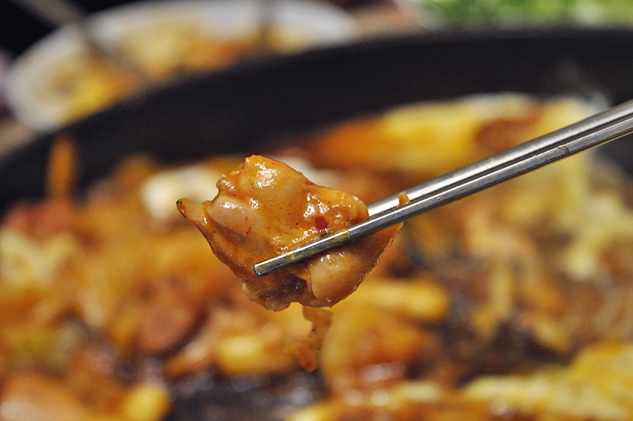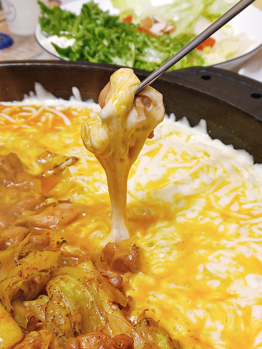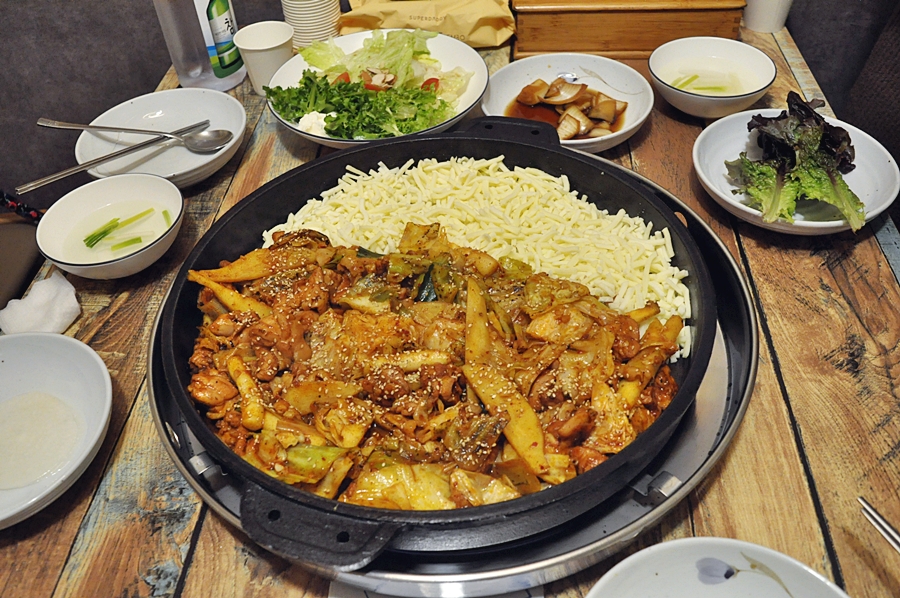 드디어 메인 요리인 치즈닭갈비가 나왔습니다. 3인분을 주문했는데 양이 상당히 많았어요. 치즈닭갈비의 경우 약 40%가 치즈로 구성되어 있어 치즈를 듬뿍 즐길 수 있습니다. 이런 구성 처음 보는 것 같아요. 보통 치즈가 조금만 들어있는 경우도 많은데요, 여기는 그야말로 미쳤다라고 할만큼 치즈가 듬뿍 들어가 있어요.
