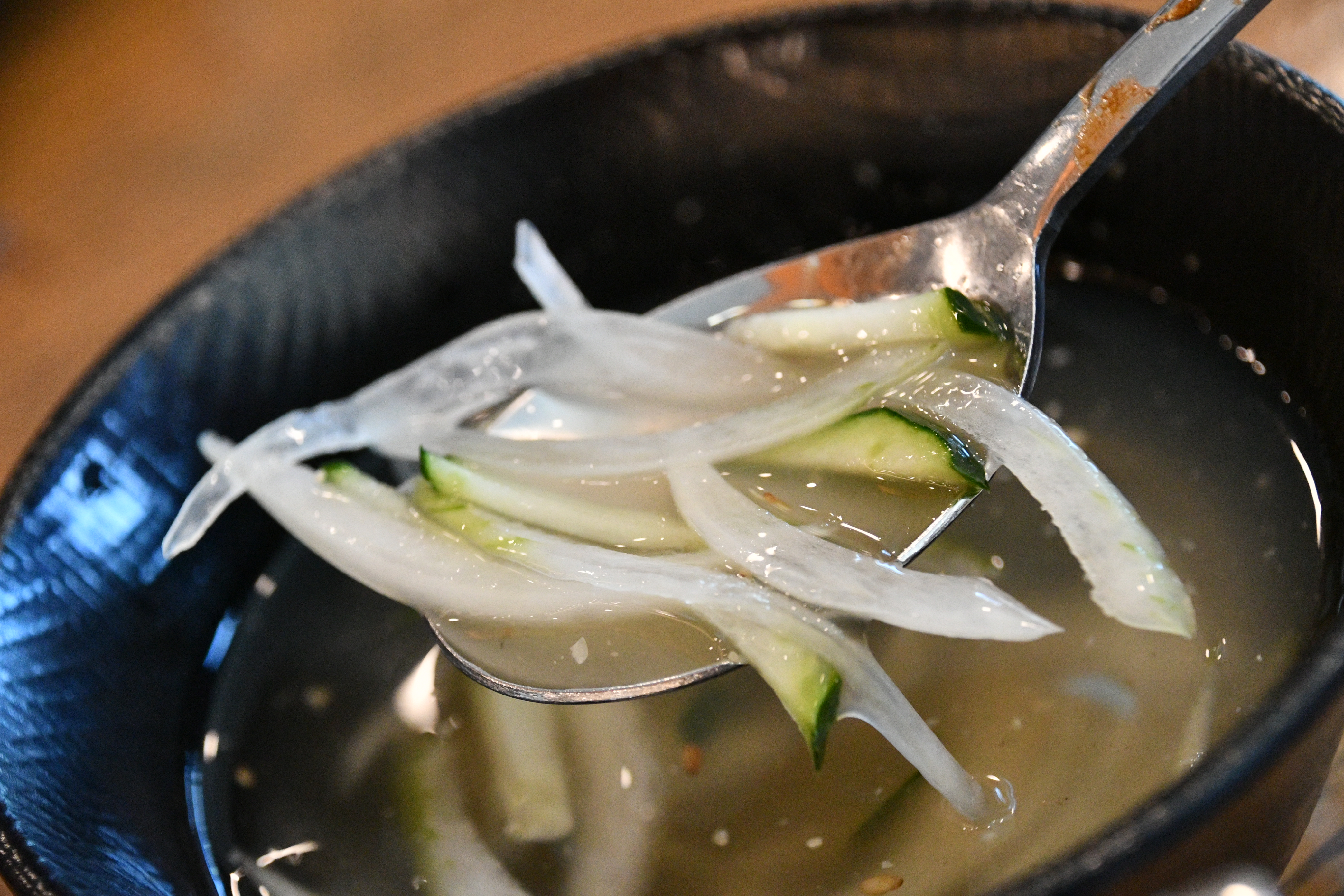 주문과 함께 기본 반찬이 하나둘 세팅되는데요, 단무지, 양파, 파김치, 배추김치, 오이냉국 등 기본 구성도 정갈하게 잘 나옵니다. 그런데 여기서 놀라운 서비스가 하나 더! 김치전과 달걀후라이가 무료로 제공된다는 점이 정말 반가웠어요.