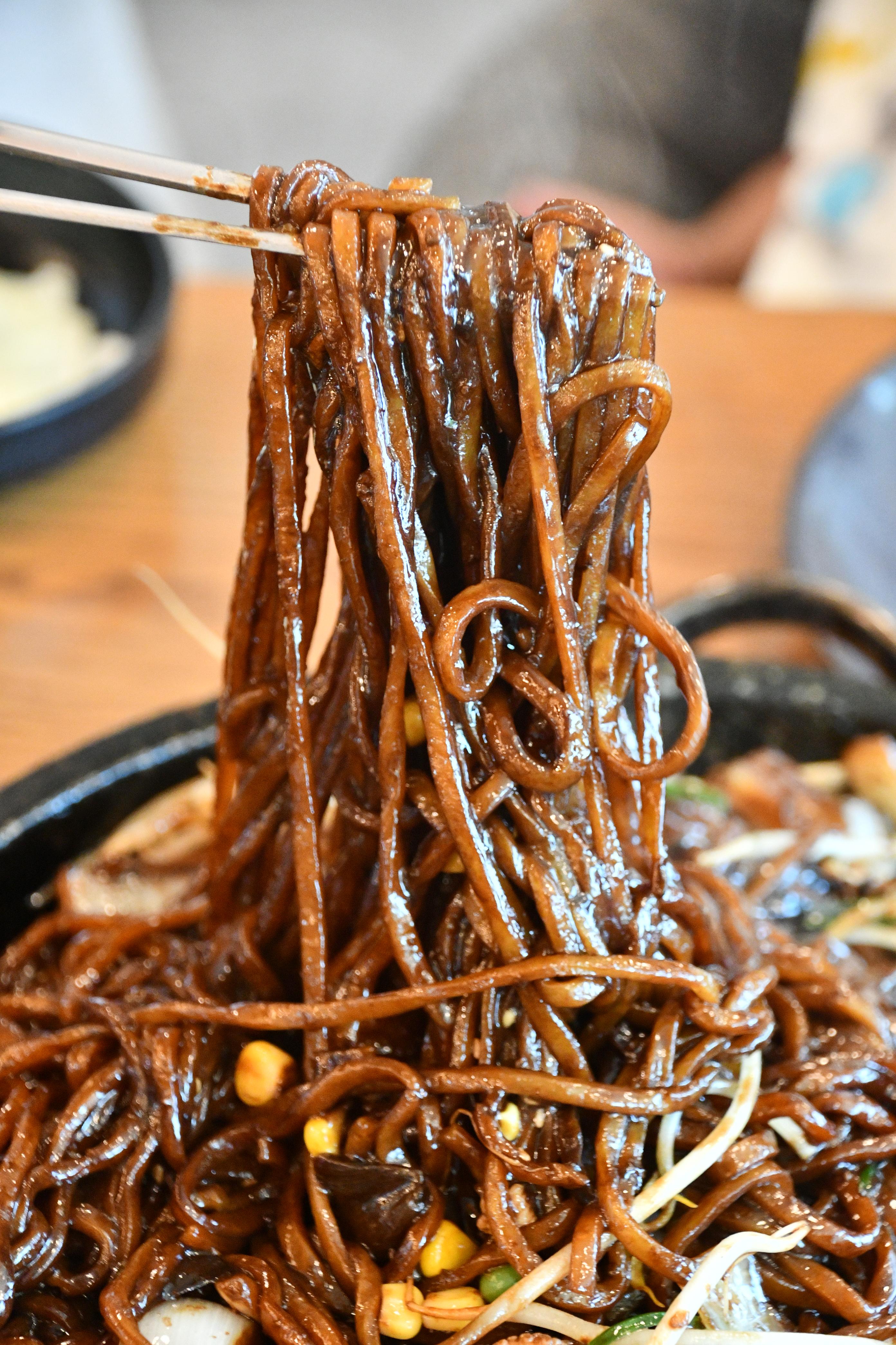 이날의 하이라이트는 단연 돌판 위에서 지글지글 등장한 돌짜장이었습니다. 고열의 300도로 달군 돌판 위에 짜장면이 얹혀 나오는 비주얼부터가 압도적이었어요. 음식이 테이블에 도착하는 순간 퍼지는 짜장 냄새와 함께 ‘지익~’ 하는 소리가 식욕을 제대로 자극합니다. 돌판에 눌려 살짝 바삭하게 익는 면발, 진한 짜장 소스와 고소한 불맛이 어우러져 일반 짜장면과는 차원이 다른 풍미를 만들어냅니다.