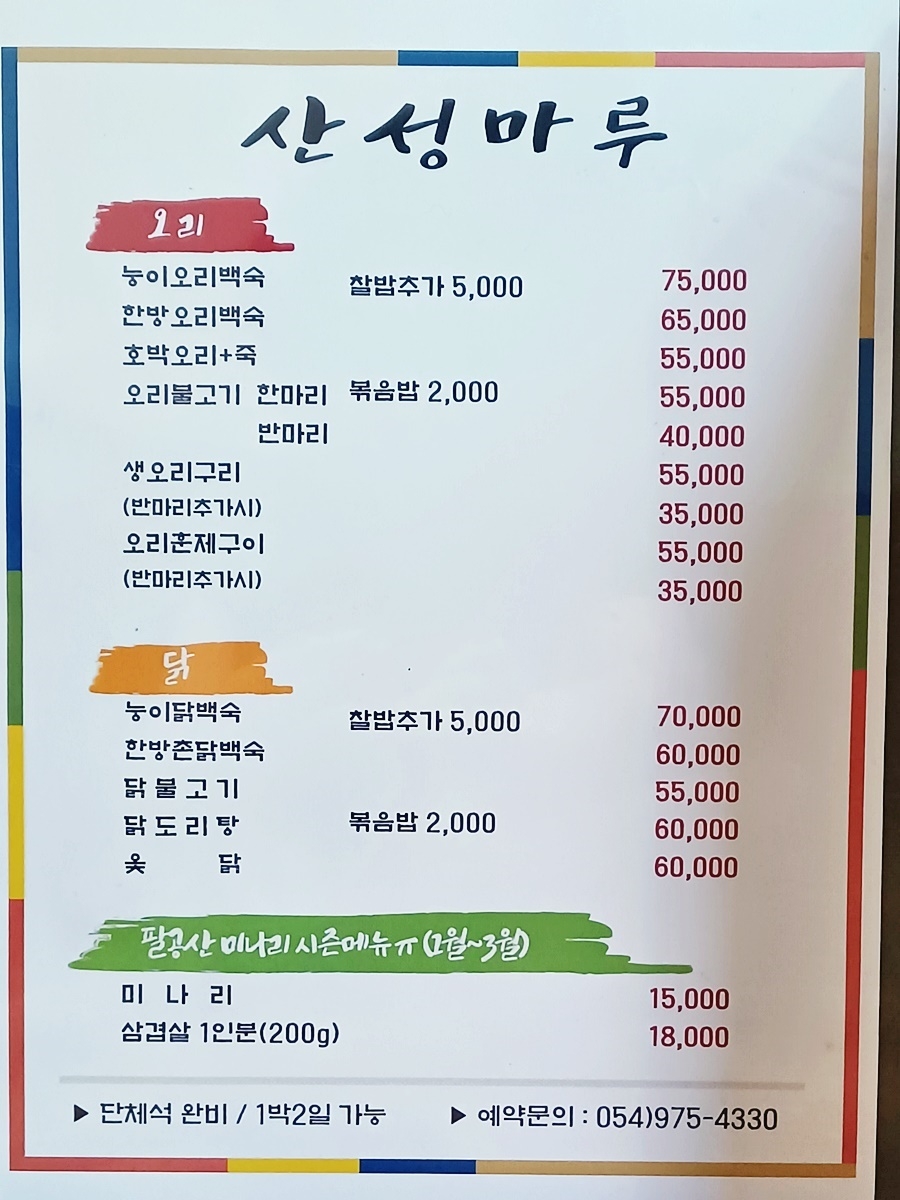 피곤하거나 기력이 떨어질 때, 몸보신을 위해 떠오르는 음식 중 하나가 바로 오리 백숙입니다. 많은 보양식이 있지만, 저는 특히 오리 고기의 담백함과 깊은 국물 맛 때문에 닭백숙보다 오리 백숙을 더 선호하는 편이에요. 평일 저녁 경북 칠곡 팔공산 인근에 위치한 보양식 맛집 산성마루를 방문했는데요, 음식 맛은 물론이고 주변 환경까지 너무 좋아서 추천드리고 싶은 곳입니다.